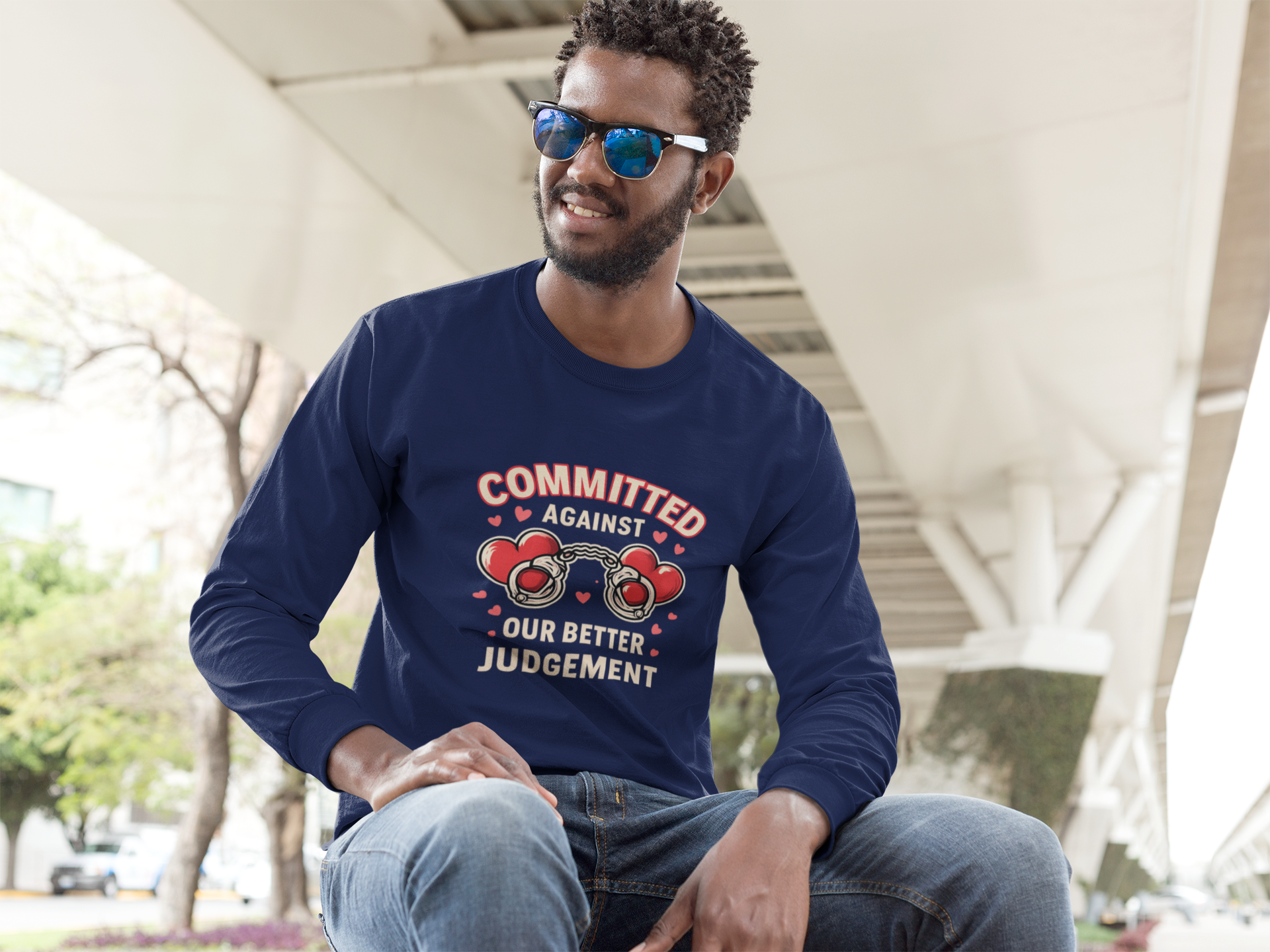 This Committed Against Our Better Judgement long sleeve t-shirt adds playful rebellion to everyday wear with a bold heart-and-handcuff graphic and a wry, affectionate message. Made from soft, vintage-feel cotton with a reassuring midweight drape, this unisex long sleeve tee feels comfortable and substantial from the first wear. Tubular knit construction, taped shoulders, and ribbed cuffs help maintain a clean silhouette and lasting shape through repeated washes. Easy to style for cool evenings, casual hangouts, laid-back dates, or Valentine’s Day humor, this cozy graphic shirt keeps the joke front and center long after February.