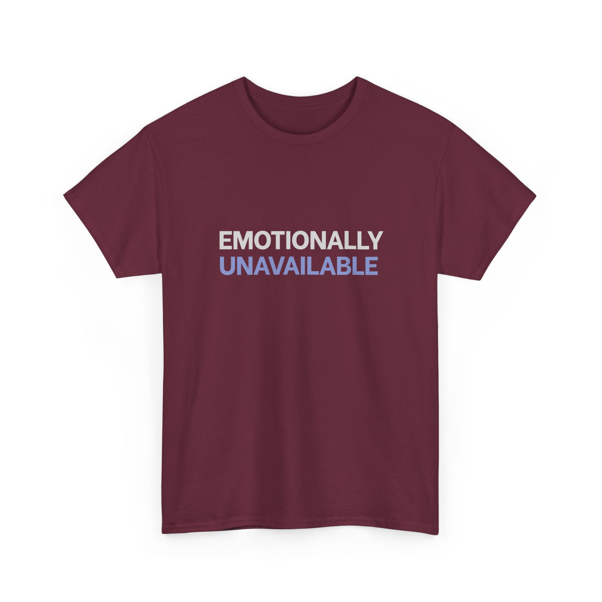 This Emotionally Unavailable t-shirt delivers understated humor with a quietly cheeky tone, perfect for those who express affection with blunt honesty. Featuring a soft, muted text design in light gray with a cool blue punchline, this minimalist sarcastic graphic tee reads like a private joke shared in public. Made from medium-weight, ethically sourced cotton, it offers breathable comfort with a relaxed fit and ribbed crew collar for everyday wear. Easy to layer under jackets or wear on its own, this unisex shirt is ideal for slow mornings, road trips, and casual outings with low-key, confident style.